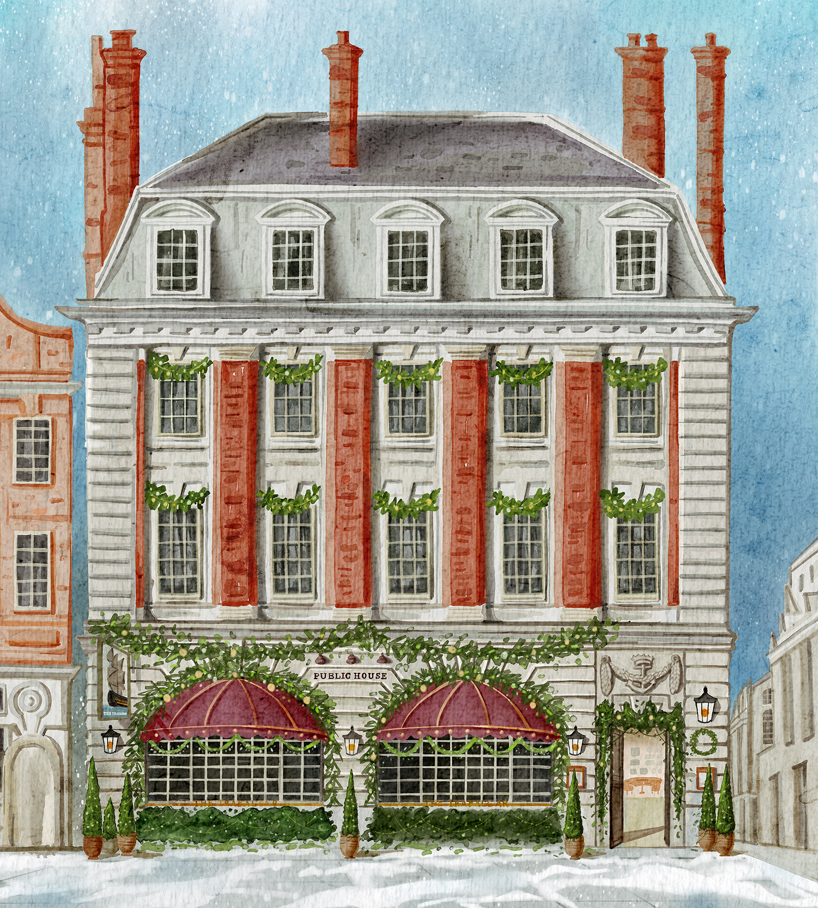Following on from the Trafalgar opening illustration, Three Cheers Pubs also required a Christmas setting for the stunning Trafalfar building face.